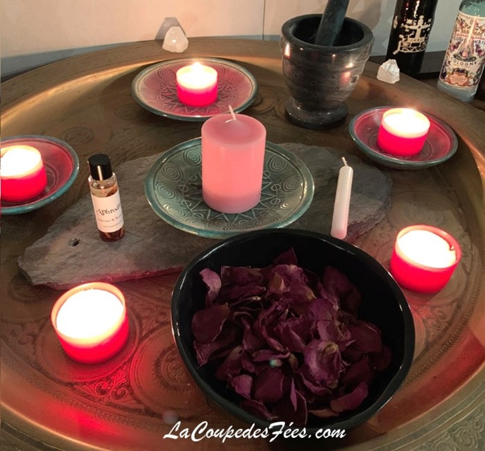D’une Huile d’onction (type Aphrodisia, Paix et protection, Happiness, Hummingbird…) ou de quelques gouttes d’huiles essentielles (type rose ou cannelle).