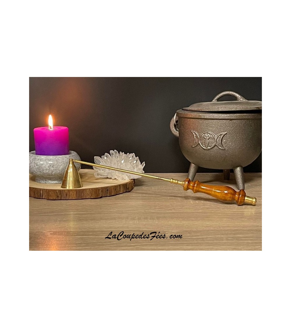 Eteignoir à bougie en laiton avec manche en bois travaillé (dont la teinte varie en fonction des arrivages).