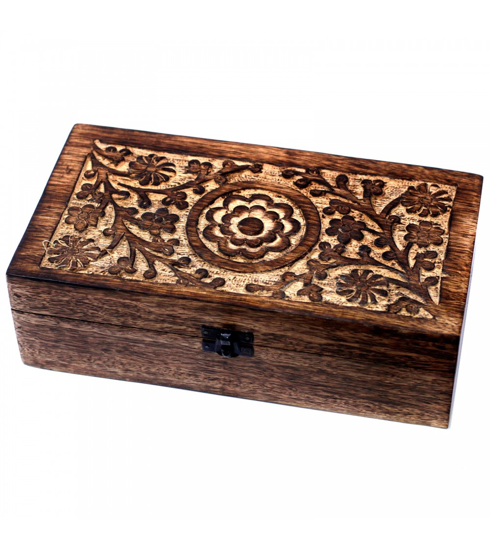 Magnifique coffret Aromathérapie en bois sculpté et orné de fleur en laiton .