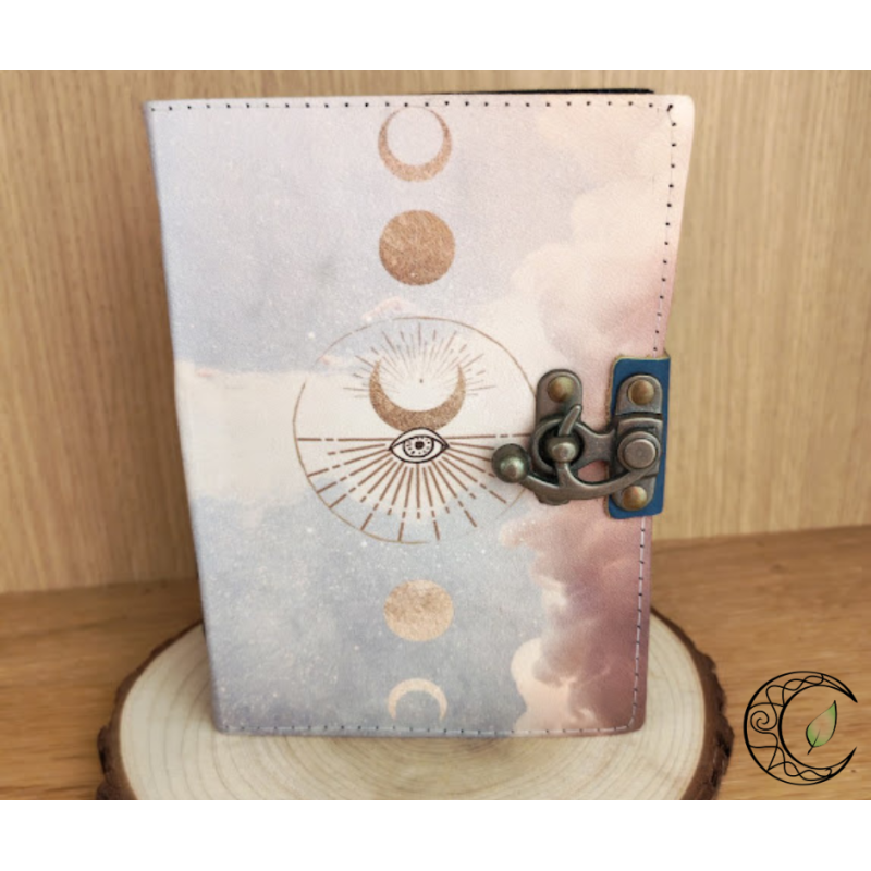 D'une douceur visuelle envoûtante, ce grimoire se distingue par sa couverture aux teintes pastel (nuages roses et bleus), évoquant un ciel de rêve ou une nébuleuse lointaine. Au centre, un œil mystique entouré d'un astre rayonnant veille sur vos écrits, tandis que l'alignement vertical des phases de la lune vous rappelle l'éternel cycle du renouveau. C'est le carnet idéal pour les rêveurs, les artistes et les âmes spirituelles.