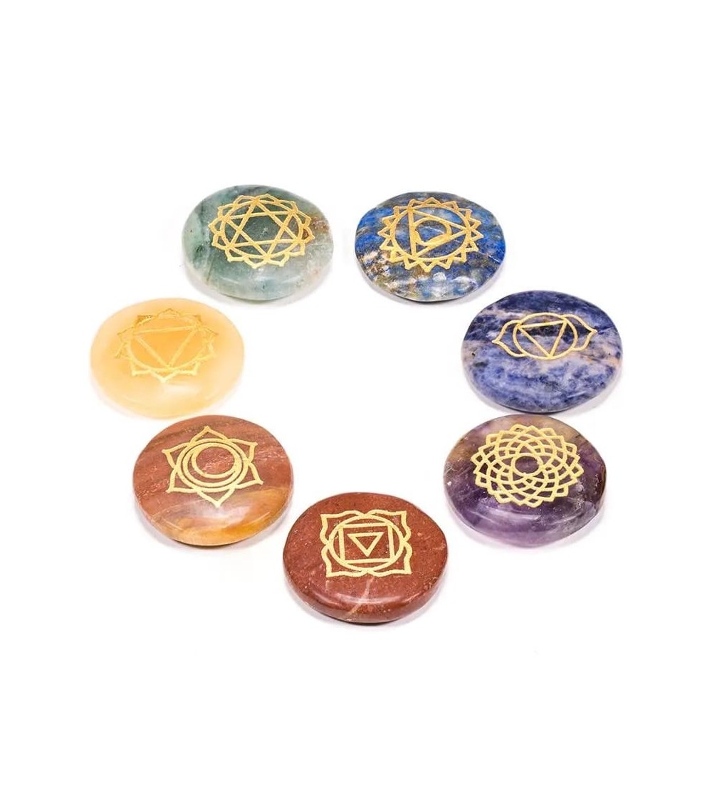 Ce kit contient 7 pierres plates d'environ 3 cm ornées des 7 chakra livrées dans un sac en velour :
